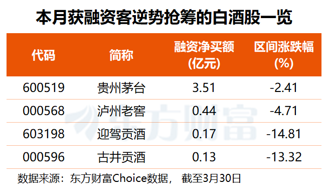 值得注意的是,东方财富Choice数据显示,有4只白酒股本月获得杠杆资金逆势加仓。其中,贵州茅台获融资客抢筹3.51亿元,泸州老窖融资净买额达4407万元,迎驾贡酒、古井贡酒均获超千万元融资净买入。