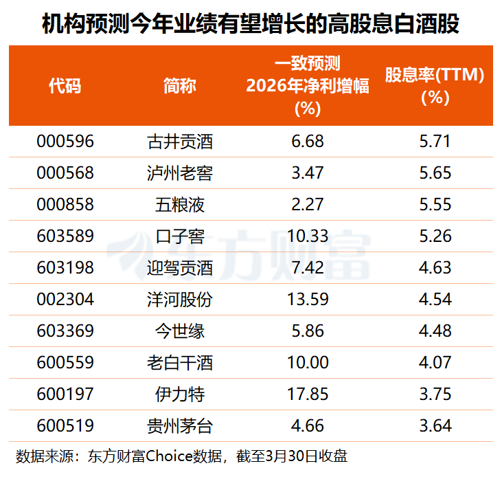 盈利预测方面,根据3家及以上机构一致预测,共有10只白酒股2026年净利润有望正增长且股息率(TTM)在3.5%以上。其中,机构预测洋河股份、口子窖、老白干酒、伊力特4股今年均有望实现两位数以上净利增长。